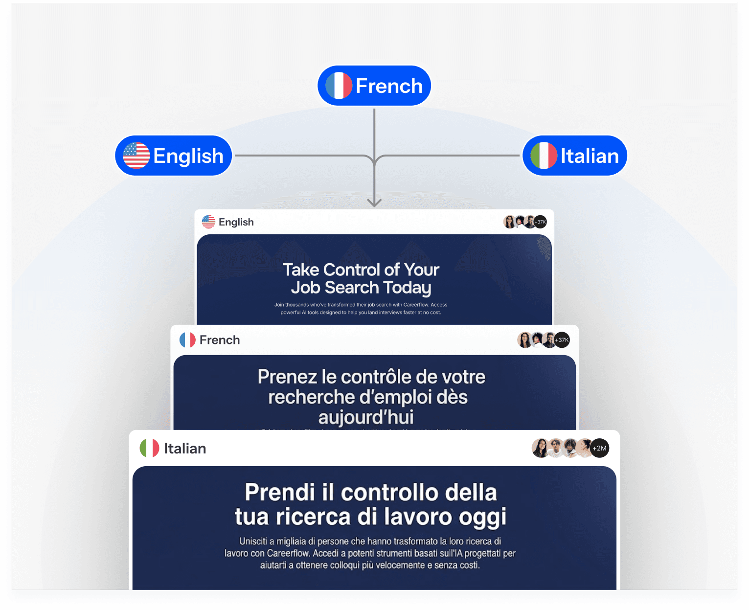 Go beyond translations with market-specific language, pricing, and context. Automatically test and deliver the best version for each region.